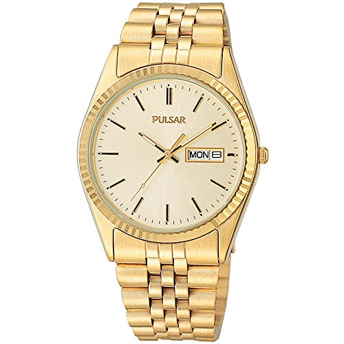 37.0mm diameter Day/Date calendar Luminous hands Water-resistant to 30 meters (100 feet) Gold-tone stainless steel Fold over clasp 3 year warranty on manufactory defects First year world wide warranty, 2nd and 3rd year only for USAFeature