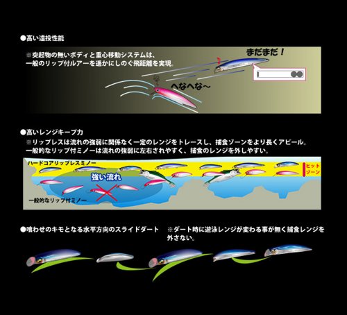 ●날을「다한」서치 베이트●립 레스 만이 가능한 높은 원투 성능을 실현.포식 존을 보다 길게 더듬어 찾을 수 있는 레인지 Keep력.먹게 하의 키모가 되는 수평 방향의 슬라이드 더트에 포식 레인지를 빼지 않는다.
