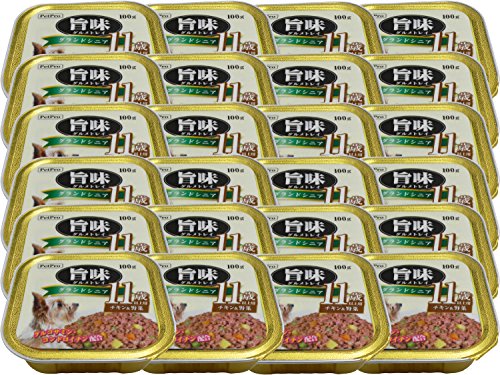 原材料:肉類(チキン、ビーフ)、でん粉類(コーンスターチ)、野菜類(にんじん、グリーンピース、じゃがいも)、食塩、増粘安定剤(カラギナン)、ミネラル類(Cu、Zn、Ca、Fe、Mn)、ビタミン類(B1、D、E)、保存料(亜硝酸ナトリウム)、着色料(三二酸化鉄)、グルコサミン、コンドロイチン