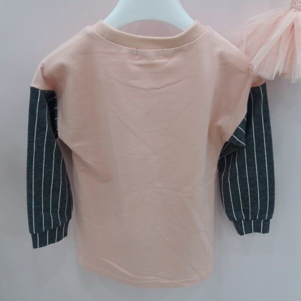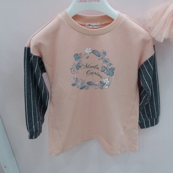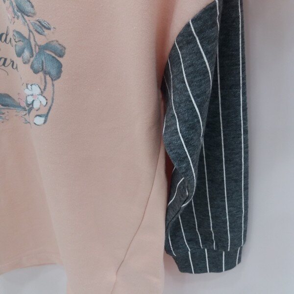 톤다운된 핑크와 차콜 스트라이프가 어우러진 기능성 롱티셔츠입니다.목부분에 시보리가 달려있어 입고 벗기 쉬우며 앞판의 꽃나염 아트웍이 포인트입니다~