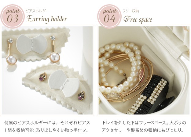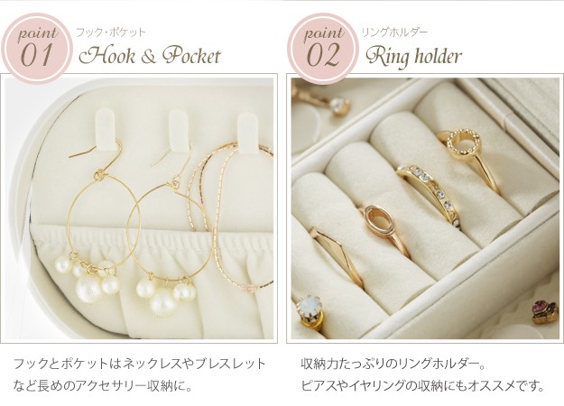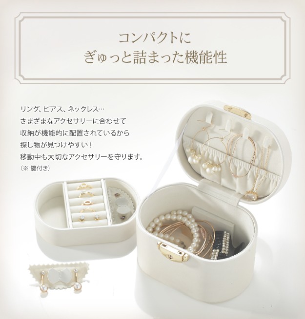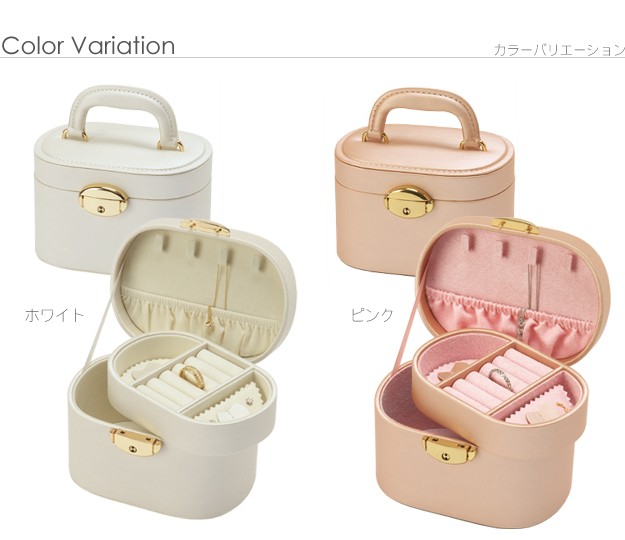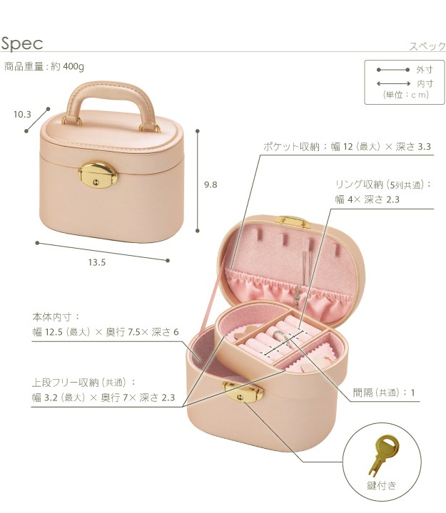 ※メーカー直送のため代金引換はお受けできません。※沖縄・一部離島は別途送料がかかります。お見積もりいたしますのでお問い合わせ下さい。商品について:取り外せるトレイが付いた2段ジュエリーボックスです。コンパクトながらも収納力は高く、15点~20点ほど入れることができます。お手持ちのアクセサリーが少ない方はもちろん、仕事中や旅行先などちょっと外しておきたいときにも安心して収納。光沢のあるソフトな色合いのケースは上品さもあり、贈り物としてもお勧めです。サイズ(cm):幅13.5x奥行10.3x高さ9.8cm・約400g下段内寸:幅12.5x奥行7.5x高さ6cmトレイの深さ:2.3cmフタ裏ポケットの深さ:3.3cmフック:4本ピアスホルダー:穴2つ×2枚鍵付きカラー:ピンク・ホワイト材質:外貼り-合成皮革(PVC)、内貼り-スエード調完成品株式会社ナカムラ(12700005)