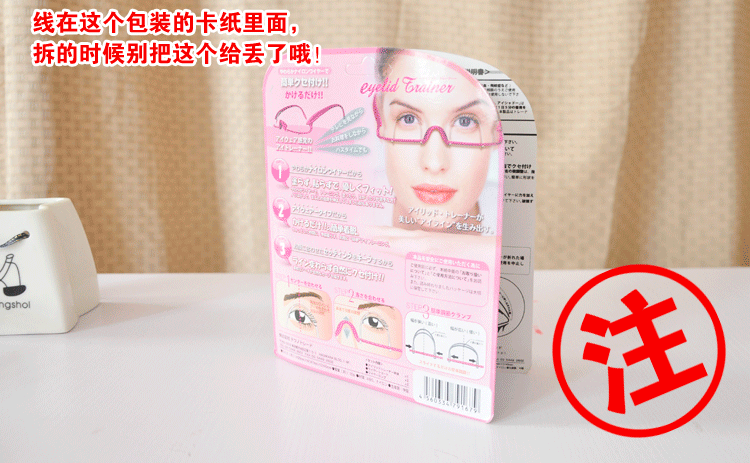 这款神器,有个塑料包装盒,可以先打开,然后眼镜架旁边的卡片里面有4根专们为眼睛设计的柔软塑料线(对眼皮没有一点伤害,请放心使用),之后依次安装好,让它呈现我们图片的样子,之后就可以戴上了!