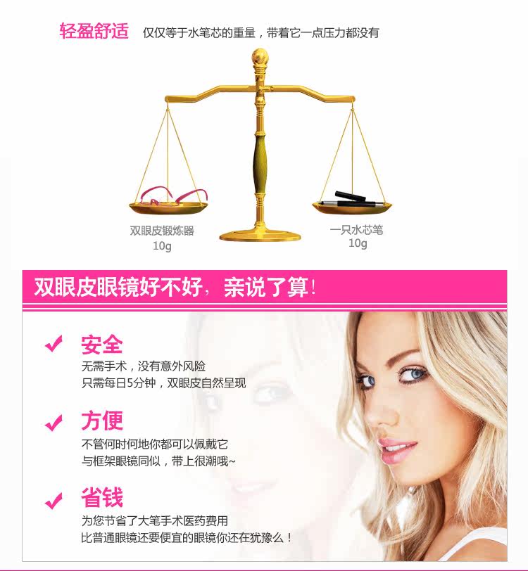 最后掌柜想说一句:只要有耐心,铁棒磨成绣花针,如果想不动刀,不去韩国,那此款神器,是让你成为真正双眼皮的不二选择,期待更美的你,亲,赶快下单吧!!!