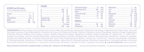 complete nutrition modeled after breast milk: includes vitamins D, C, A and essential minerals like Iron, Calcium.