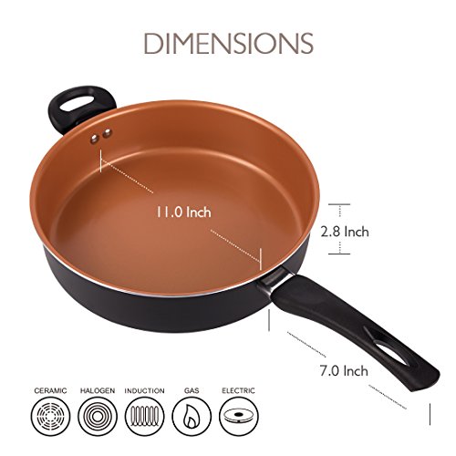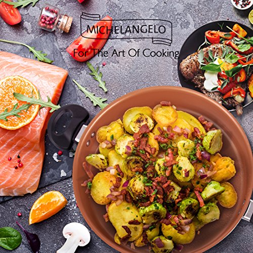 ERGONOMIC LONG HANDLE & HELPER HANDLE - The Michelangelo non stick fry pan is specially designed with a long handle that fits perfectly in your hands for a comfortable grip. The helper handle provides extra support and balance when lifting and pouring. The 5 quart / 11inch saute pan is perfect for day to day cooking