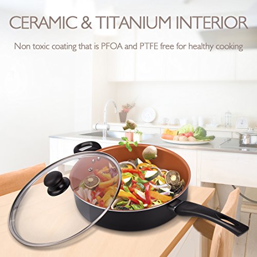 SCRATCH RESISTANT MULTIPLE LAYER NON STICK COATING - Michelagenlo Non-Stick Saute Pan is perfect for everything you need to stir-fry. The superior Ceramic & Titanium interior makes it ideal for use over high heat with minimum oil and lots of flavor