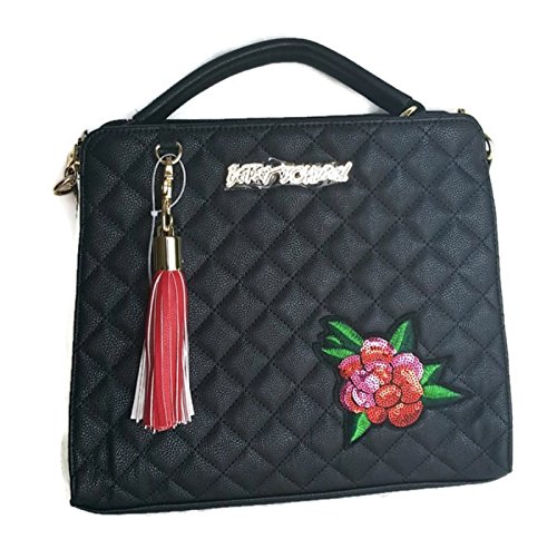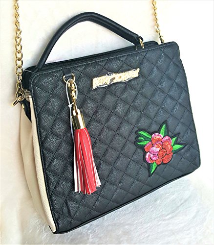 Overall Quilted Black PU Leather Body & Cream color Trim. Top Front has a Betsey Signature Logo & Bottom Right corner has an Embroidered, Sequin Red Floral Decorations giving it a unique look! Front has a Detachable Red color Tassel with Gold-tone Metal hardware with an engraved Betsey Signature on it. Inside of the purse has 2 Compartments: 1st has a magnetic snap closure(2 interior slip pockets inside), 2nd compartment has zippered closure (with a zippered pocket inside) The small handle is attached between the 2 compartments which has approx 4" drop. Longer Handle has 23" drop Bag Dimensions: Length 13" x Depth 5" x Height 10.5"