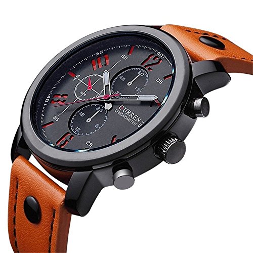 -. Feature : Round watch dial with 3 decorate sub-dials and clear hour marks, fashional and elegant. / Leather strap with stainless steel buckle,it's comfortable to wear. / Quartz movement with analog display with simple dial,easy to read. / Water resistant up to 3 ATM/ 30 M/ 98.43 ft (Suitable for daily life. Splash/rain resistant.NOT suitable for diving, swimming, snorkeling, and please don't press the button in water!) / Luxury simple design watch,perfect gift for men.