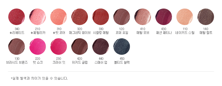 강렬한 색감에 은은한 쉬머펄을 더해 어느 각도에서도 반짝이는 세련되고 화려한 메탈릭 매트 립스틱