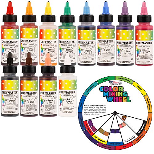US Cake Supply by Chefmaster Airbrush Cake Color Set - The 12 Most Popular Colors in 2.0 fl. oz. Bottles with Color Mixing Wheel