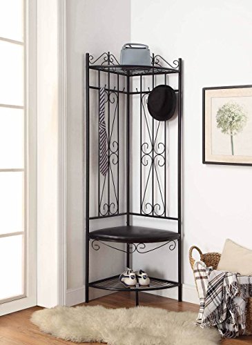 -. Title : Black Metal Corner Entryway Hallway Hall Tree Shoe Rack with Black Bonded Leather Bench & 6 Hooks Scroll Design