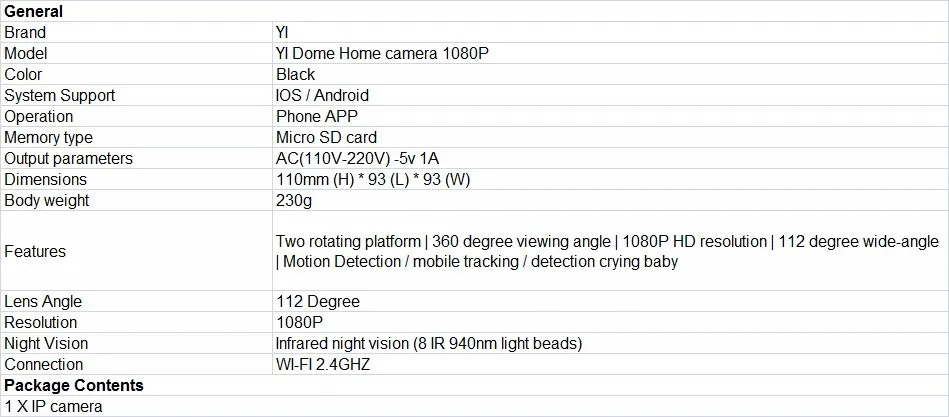YI 1080p Home Camera/ AC Adapter/ USB Cable/ User Manual (with Warranty Card)