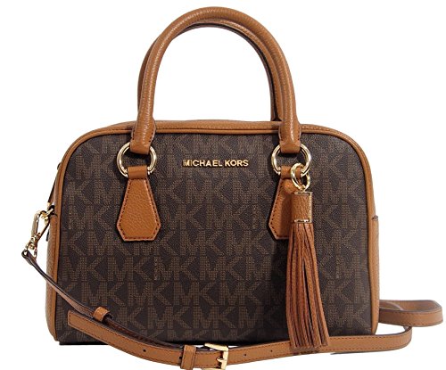 -. Brand : Michael Kors -. Color : Brown -. Department : womens -. EAN : 0191262020117 -. Feature : Logo print PVC with pebble leather trim; Gold-tone hardware / Top zipper closure / Back slip pocket / Interior features zip pocket and 4 slip pockets / Dimemsion: 11.5"W X 8"H x 5"D; Removable / adjustable strap with 24" drop -. PackageQuantity : 1 -. ProductGroup : Shoes -. ProductTypeName : HANDBAG -. Size : Medium -. Title : Michael Kors PVC & Leather Convertible Medium Tassel Satchel Crossbody Handbag Bag - Brown / Acorn -. UPC : 191262020117