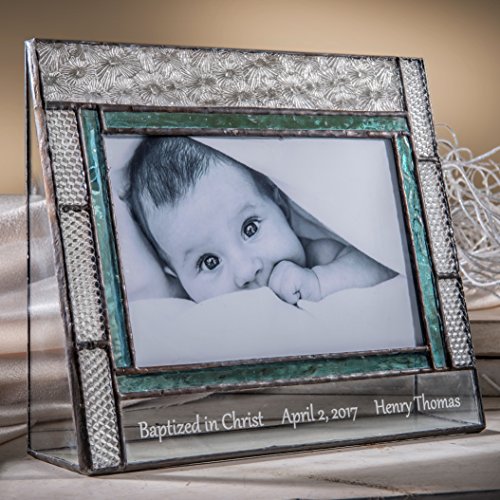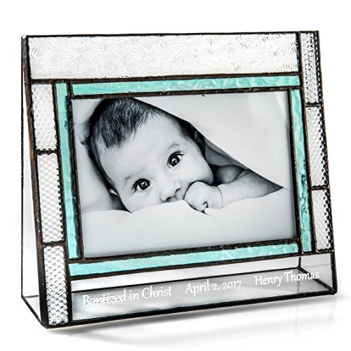 Studio : J Devlin Publisher : J Devlin Binding : Kitchen Product Description This table top 4x6 stained glass picture frame features an aquamarine blue and clear textures that glistens in the light. Perfect for a baptism or Christening keepsake gift. Engrave with the baby name and date to make this a personalized gift that will be cherished for a lifetime. Photo size 4x6 horizontal landscape image. 0