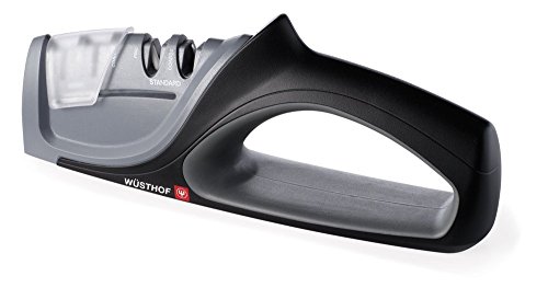 Sharpen both your Standard knives and your Asian style knives with the Wusthof 4 stage knife sharpener. The standard sharpener uses carbide blades set at 28 degrees or 14 degrees per side to sharpener your standard kitchen knives. Stage 2 of the standard side uses ceramic rods to hone a fine edge on your blade. Simply slide the cover over to Asian knives to sharpen your Asian knives to a 20 degree angle or 10 degrees per side. The V-shaped cutting head with two crossed carbide blades puts a quick edge on knives. Stage 2 uses ceramic rods to hone the fine edge of your Santoku or Nakiri knives. Simply place the gadget on a flat work surface and hold the E-Z grip handle with one hand and the knife handle with the other. Insert the knife blade fully into the slot at a 90-degree angle to the sharpener and pull down and back three or four times to sharpen. After setting the knife's edge with the carbide side, use the unit's ceramic side to nicely finish the edge. The four-stage knife sharpener measures 9 by 3 by 1-1/2-inches.Feature