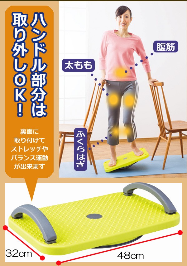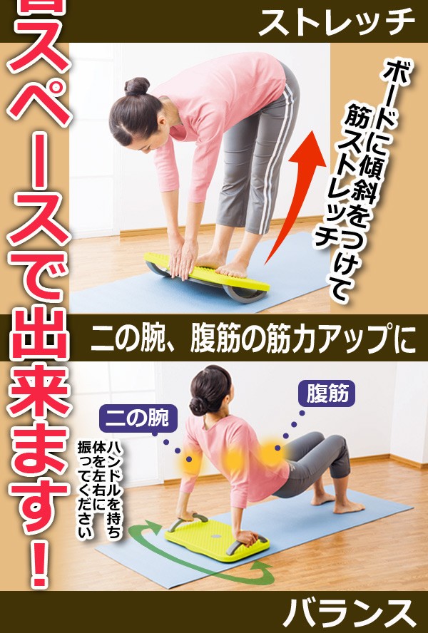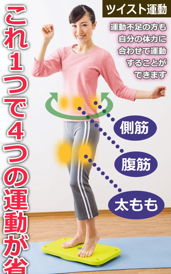 これ1つでお家で手軽に4つの運動が出来るエクササイズボード。ツイスト運動、ストレッチ、二の腕・腹筋の筋力アップ、バランス運動に!省スペースでお部屋で気軽に始められます。エクササイズボードは運動不足の方も自分の体力に合わせて運動することが出来ます。運動/エクササイズ/ダイエット器具/ストレッチ/ツイスト運動/バランス運動/腹筋/側筋/二の腕ひきしめ/筋力アップ/代謝アップ