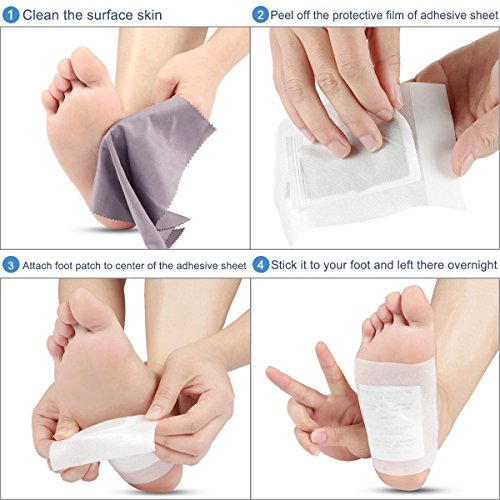 Tips for Best Results - Clean your feet before going to bed - Put the foot patch on the arch of the foot while put the printed side to the adhesive side - Wear a light sock over the detox foot pads to avoid accidental displacement - Pads should be left in place for 6 - 8 hours - Tear off after getting up in the morning, please do not reuse it