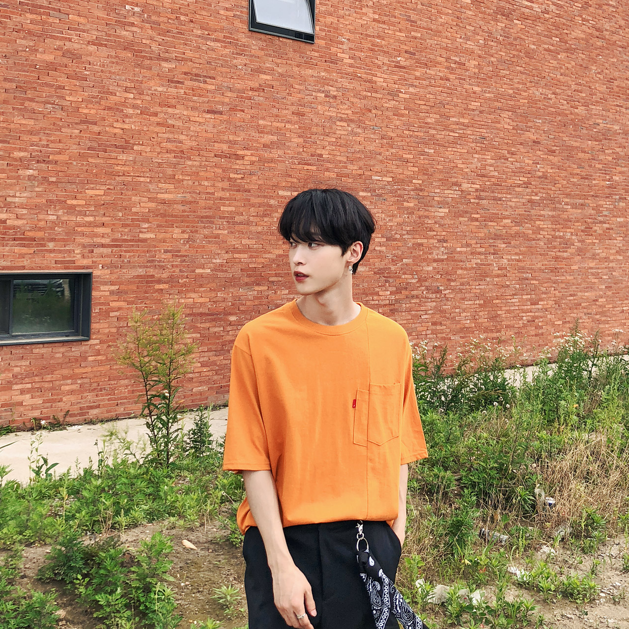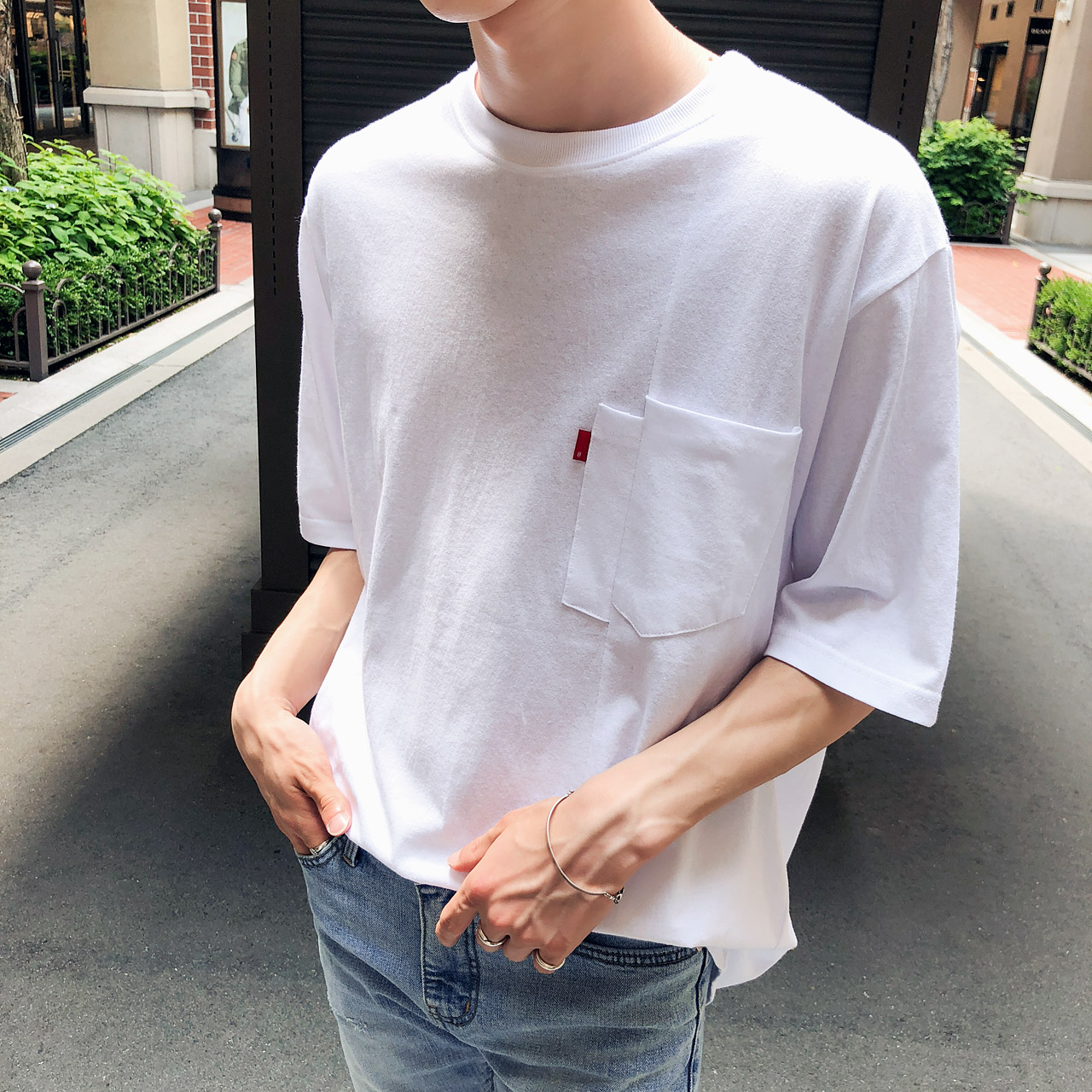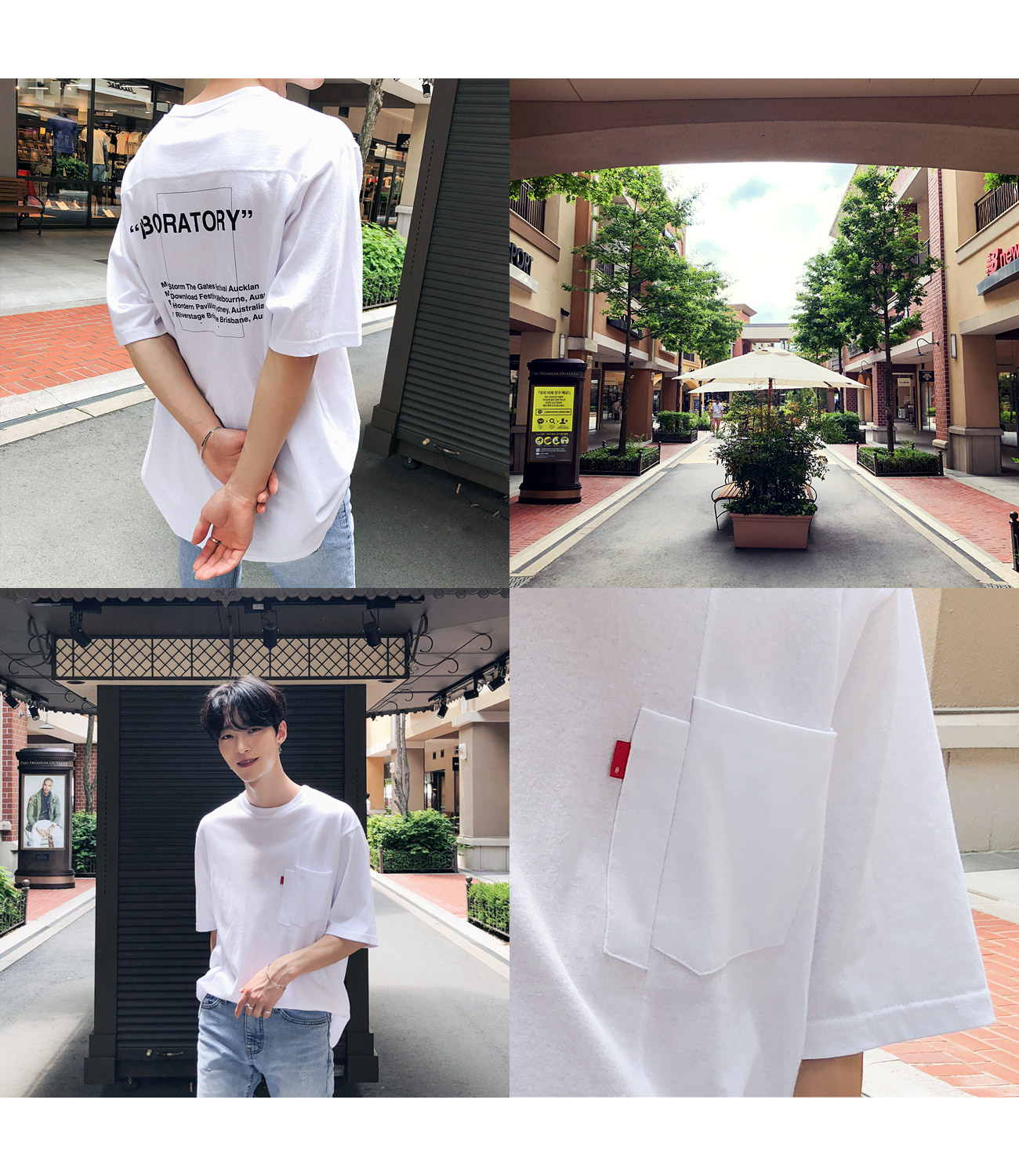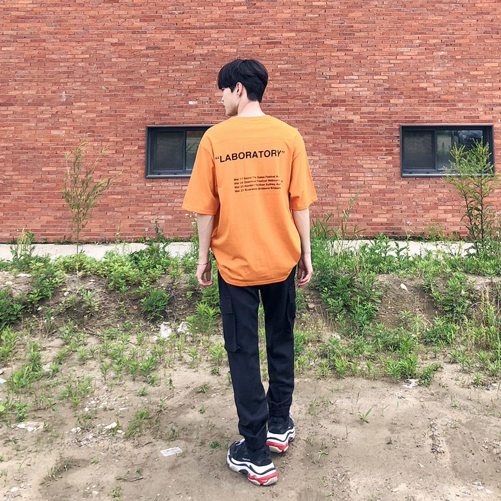 포켓 절개 레터링 반팔티셔츠