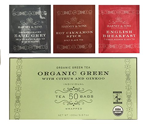 -. Feature : Harney & Sons Organic Green with Citrus Ginkgo 50 Tea Bags (With Bonus 1 English Breakfast ,1 Decaff Earl Grey,1 Cinnamon Spice) Total of 53 Tea Bags / Egypt provides us with the finest chamomile flowers, we use only flower heads with no extenders / English Breakfast has an ancient pedigree / Earl Grey,it was inspired by the British P.R.Ime Minister, Earl Grey / Certified Kosher and steep for 4-5 minutes in boiling water before drinking