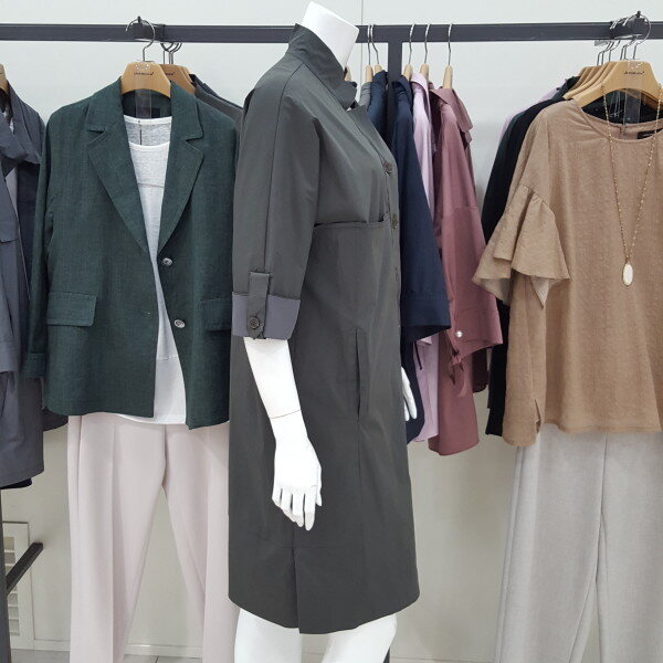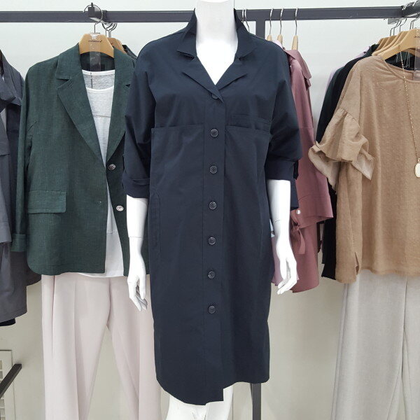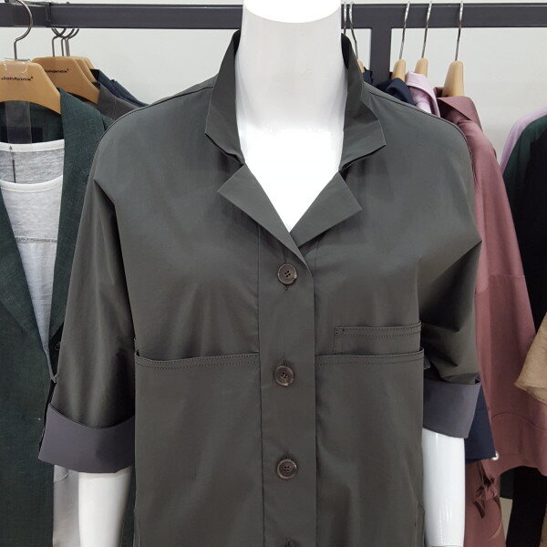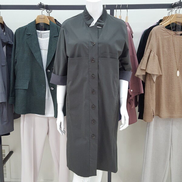 시원하고 편한 스판 소재 셔츠형원피스이며 앞단추 오픈형입니다.
