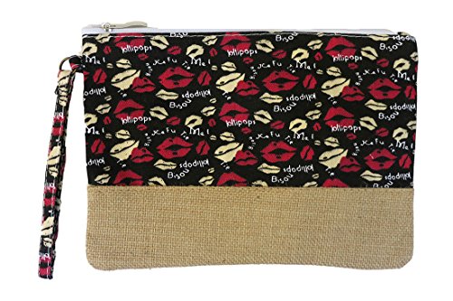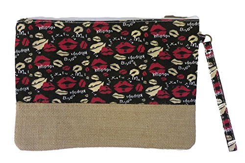 Product Description Carry your phone and other essentials securely in this generous sized wristlet pouch with "kiss" lips print on black and jute bottom. Self fabric wristlet strap. 0