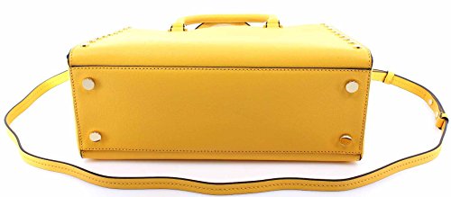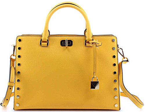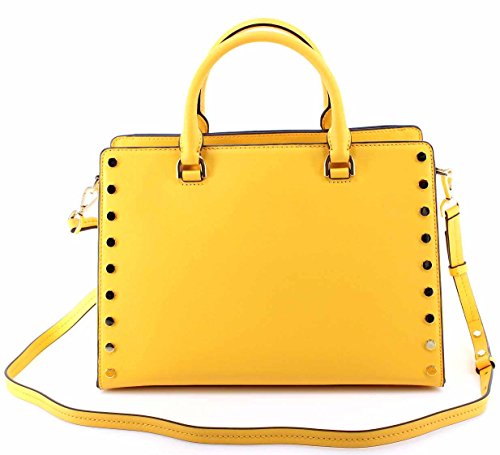 -. Brand : -. Color : Sunflower -. Department : womens -. Feature : Beautifully tanned leather with polished golden tone hardware and stud detailing / Custom logo P.R.Int fabric lined interior with center zippered pocket and open compartment on either side / Inner zippered and open slip pockets with open slip pocket with turn-lock closure on front / Adjustable shoulder and cross-body strap with a drop of approximately 21-23 inches / Measures approximately 13" (L) x 9.5" (H) x 5.5" (W) -. Model : 30T7GYFS3L -. ProductGroup : Shoes -. ProductTypeName : HANDBAG -. Title : Sylvie Studded Large Leather Satchel Shoulder Handbag