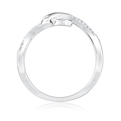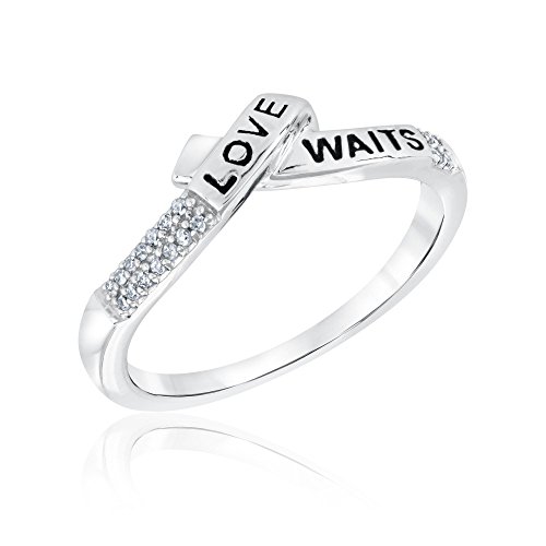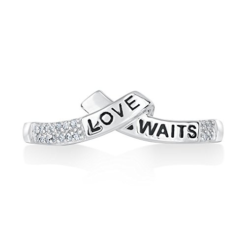 This sterling silver purity ring features the words Love Waits in black antique letters as well as eighteen round diamonds. Diamonds are 0.05ctw, K or better in color and I3 or better in clarity. Ring is 5mm at the top and tapers down to 2mm.