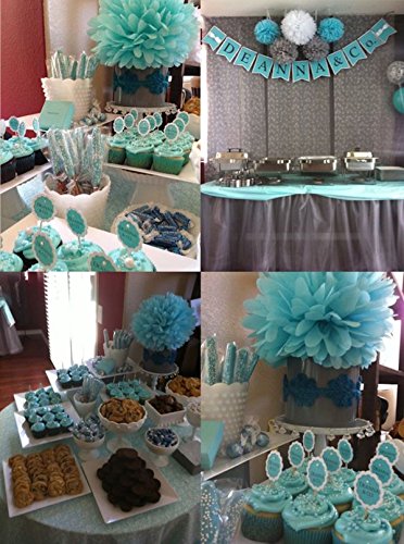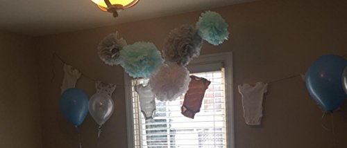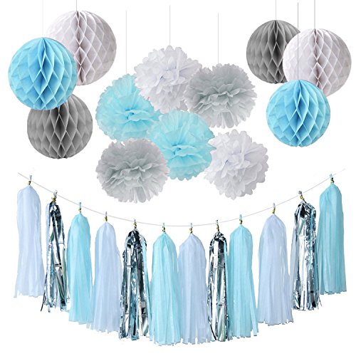 Blue grey white elephant baby shower decorations Party Kit Package List: 6 pcs tissue paper flowers:2 pcs baby blue(1*12inch 1*10inch) 2 pcs white(1*12inch 1*10inch) 2 pcs Grey Tissue Paper Pom Poms(1* 12inch 1*10inch); 1 pack of baby blue white silver mixed color tissue paper tassel with one white ribbon and using instruction,totally 12 sheets,each color comes with 4 pcs. 6pcs white grey blue mixed color honeycomb balls,each color comes with 2 sizes:1 pcs 6inch 1pcs 8inch. Tissue Paper Craft are so much fun. They appear to float in the air, adding a cheery atmosphere to any event. Perfect for a rehearsal dinner, birthday party, bridal shower, or casual reception. 0