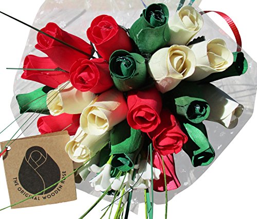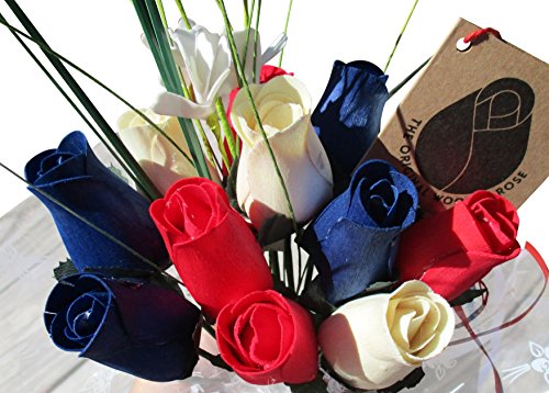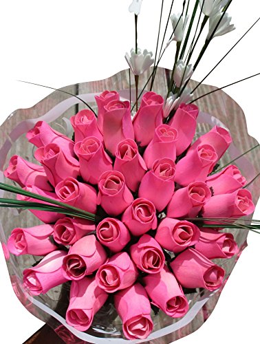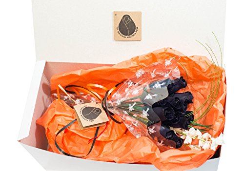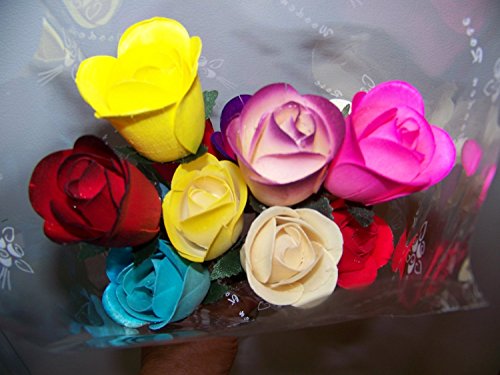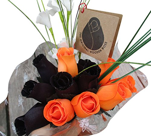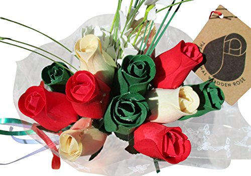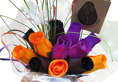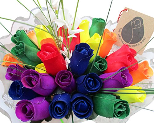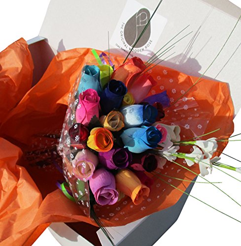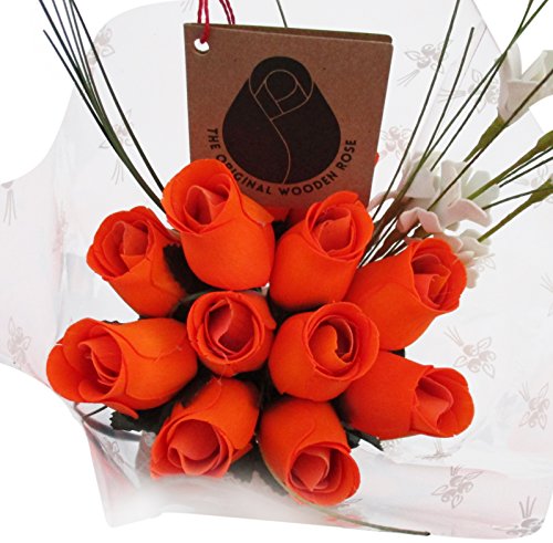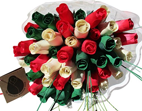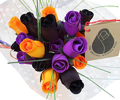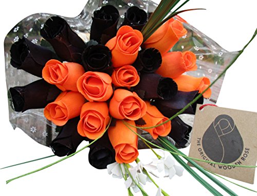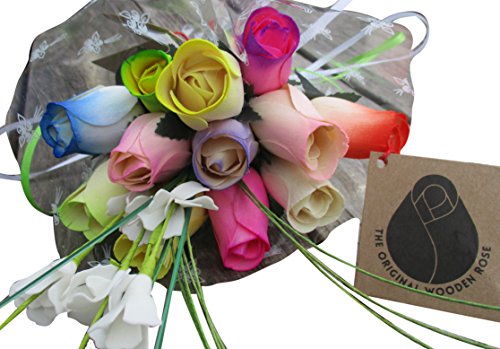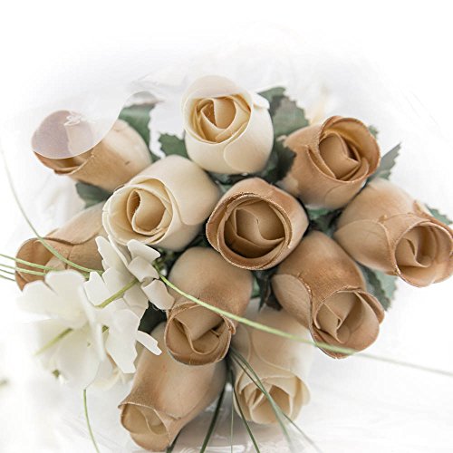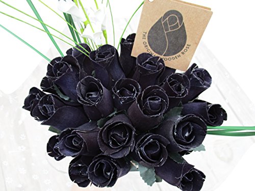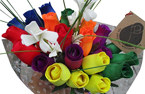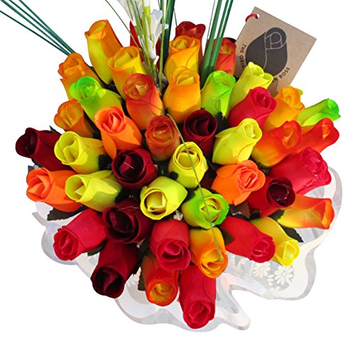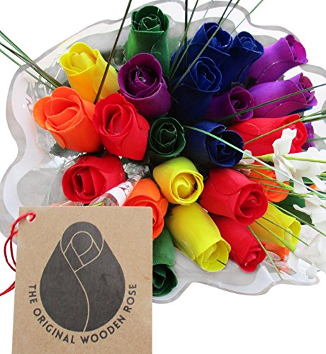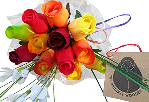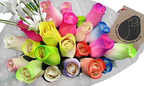 The Original Wooden Rose Birch Wood Bouquets Brighten your day with beautiful birch wood rose bouquets from The Original Wooden Rose. Hand carved from delicate birch wood, these flowers never die, wilt or need watering. They Come in a stunning array of colors to add a life like touch of beauty to your home or office. The Original Wooden Rose bouquets also make Fabulous decorations for weddings, birthdays and holidays. Each bouquet comes with artificial grass, our exclusive accent flower, in a floral sleeve . Each bouquet comes with an attached information card, perfect for gift giving. Each closed rose bud is a 2-inches tall, with a 13 inch stem. Choose from bouquets of one, two, or three dozen roses. Browse our selection to discover your perfect bouquet today! Please remember this is a natural product, not made by a machine, It will have natural ctacks in the petals.Feature