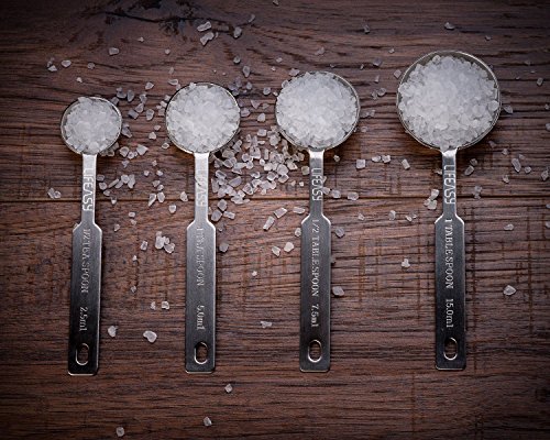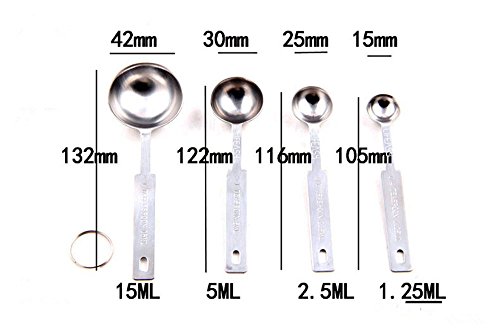 - SET OF 4: 1 Tbsp (15 ML), 1 tsp (5 ML), 1/2 tsp (2.5 ML), 1/4 tsp (1.25 ML)