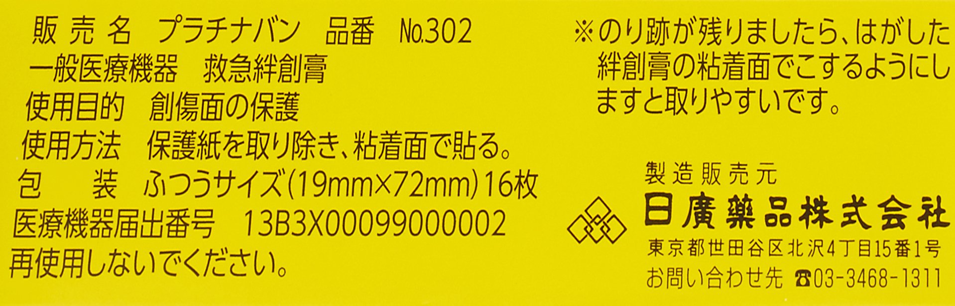 "Platinum van № 302 normal 16 sheets" is a sanitary cloth type bandage plaster containing "antibacterial ingredient" as an adhesive.