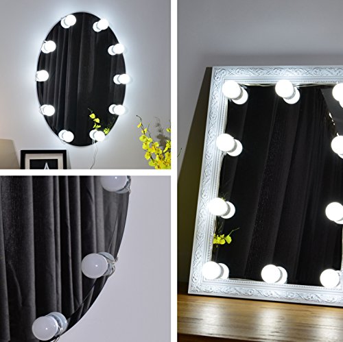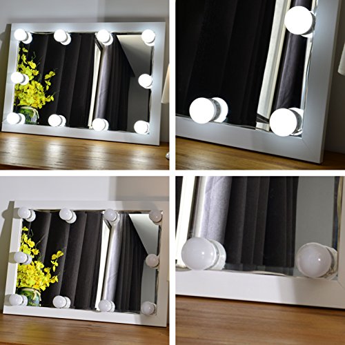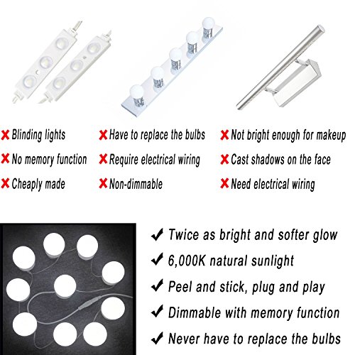 10 LED bulbs produce a soft and bright glow. 6,000K white light closely simulates natural sunlight, providing a professional color-correct lighting for makeup.