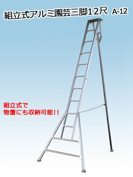 業界初の組立式アルミ園芸三脚!箱入りでコンパクト!物置にも収納可能です。植木の込み入った中でも入れる狭い登り階段。組立式。 |