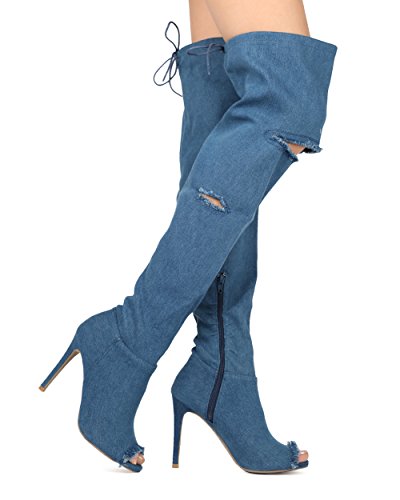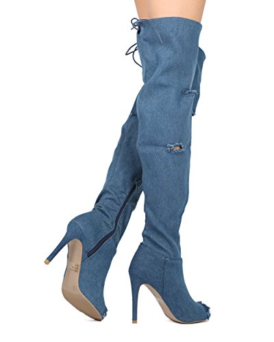 (Alrisco)/Women's/Boots/DIRECT FROM USA/Alrisco Women Frayed Denim Peep Toe Over The Knee Stiletto Boot - HG40 by Wild Diva Collection