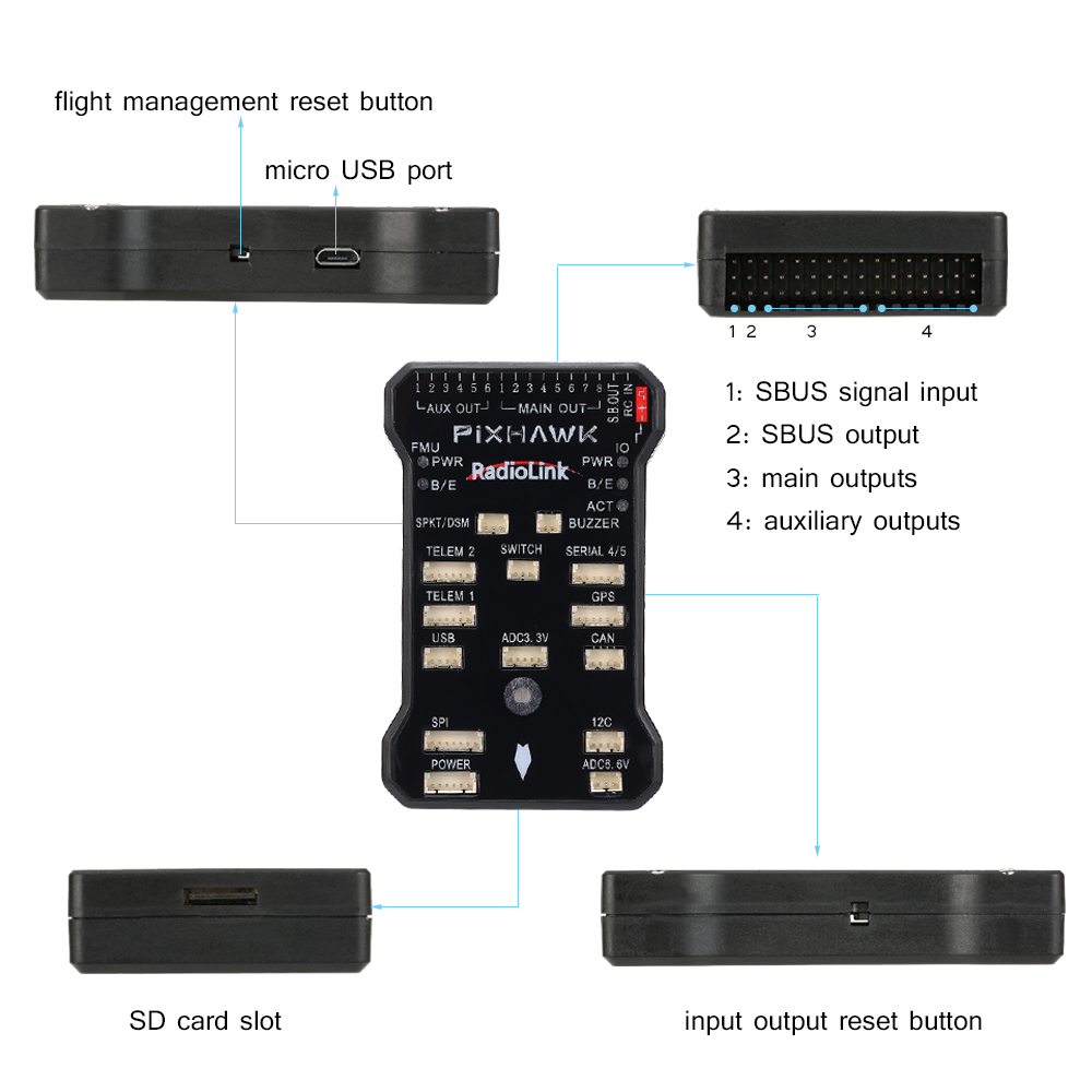 This Pixhawk flight controller from RadioLink has optimized the PCB layout and the barometer height hold, provides more stable flight performance even at high speed. It intergrated the newest 32 bit chip technology and high-end sensors, this is ly one of the best flight controller for quadcopters.