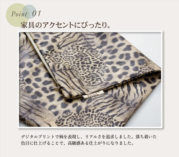 デジタルプリントのリアルさを再現したクッションカバーです。表地はしっとりとした肌感触で、高級感のある風合いに仕上げました。かっこよく男っぽい商品でお部屋のイメージチェンジにお使いください。本商品はファスナータイプですので付け外しが簡単です。ご家庭の洗濯機で丸洗い可能なので清潔にご使用頂けます。