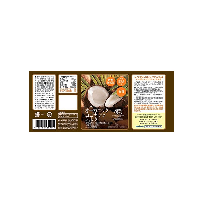 레인 포레스트 허브 오거닉 코코넛 밀크400ml 유기JAS인정 식품BPA(내분비 교란 화학 물질로서의 염려)가 녹아 내는 리스크를 피하기 위해서(때문에) 관안쪽으로 BPA의 사용을 하고 있지 않습니다