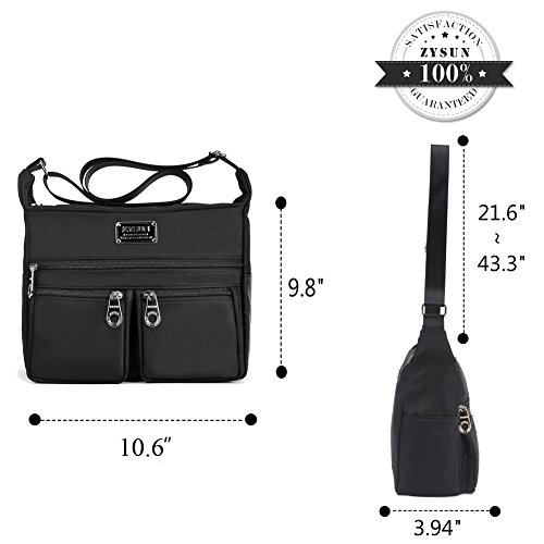 The crossbody bag with chic, stylish, practical and roomy design. Select high-quality water resistant material nylon, lightweight, soft, breathable, practical and durable. Perfect choice for travelling, hiking, gymming, shopping and everyday use. PRODUCT FEATURES 1.Durable Material, Last Long-Nylon is a sturdy material, water repellent, resistant to abrasion and fire-retardant. Highly durable, packable, washable, lightweight and stylish. 2.Roomy and Utility Crossbody Bag-Multiple pockets design,main pocket with large capacity,easily fits books,cell phone, wallet, makeup and toiletries.Lateral open pocket for little items,safe zipper pocket at the back,multi front zipper pockets. 3.Adjustable Crossbody Strap, Comfortable and Convenient-You can quickly change from a shoulder bag to a crossbody bag and back again.Good-looking appearance makes you easy to match any style of outfits!Suitable for college,students,businessmen,women. 4.Heavy Duty Zippers, Sturdy and Strong-Made of excellent quality zipper, Zip and unzip smoothly along the zipper tracks to open and close compartments seamlessly . Back size zipper pocket keeps all your small accessories secure yet easily accessible.Strong zippers also ensure extra strength & reliability. AFTER-SALE SERVICE we have been focused on providing fashionable, affordable bags and excellent service for every customers. any problems, please contact us freely. we ensure that we will give you the best solutions. Start your elegant life with this classic crossbody bag for women from ZYSUN! Package List: 1 x Nylon Crossbody Purse BagFeature