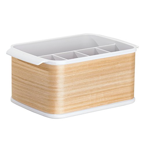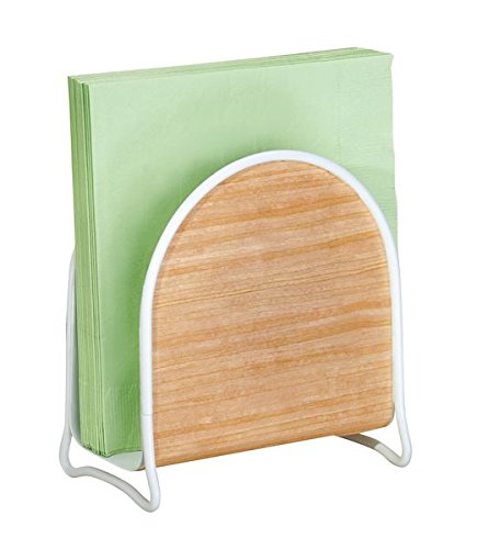 Cutlery Caddy: Made of durable plastic with real wood veneer accent in light finish. Napkin Holder: Steel frame with rustproof white finish and real wood veneer accent in light finish