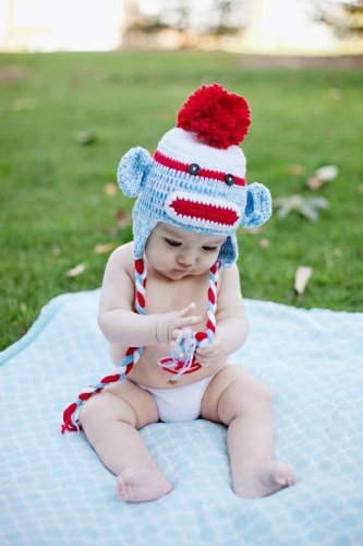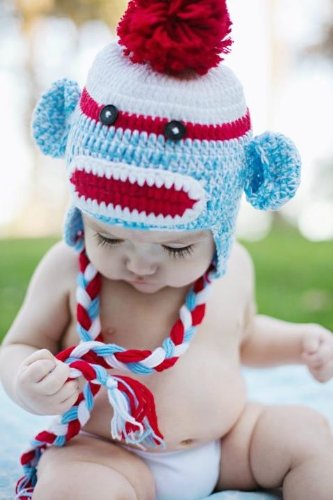 -. Title : Handmade Crochet Baby red and blue sock monkey Hat 3-12 months