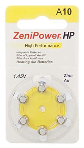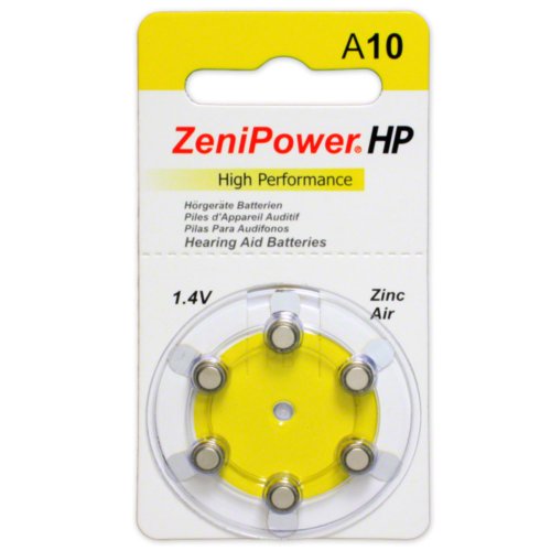-. Binding : Electronics -. Brand : ZeniPower -. EAN : 6923601280111 -. Feature : The zinc-air cell has the highest energy density of any battery system. / High drain output: Will power the heaviest duty hearing aids easily. / Excellent Sealed Shelf Life: Up to three years shelf life sealed with tab. / Flat Discharge: Constant output voltage makes less adjustment of your hearing aid. / 60 batteries Standard dial pack, 10 cards of 6 cells each -. Label : ZeniPower -. Manufacturer : ZeniPower -. Model : Size 10 Yellow -. MPN : Size 10 Yellow -. PackageQuantity : 1 -. PartNumber : Size 10 Yellow -. ProductGroup : Health and Beauty -. ProductTypeName : CONSUMER_ELECTRONICS -. Publisher : ZeniPower -. Studio : ZeniPower -. Title : Zenipower Hearing Aid Batteries Size: 10 (60 Batteries)