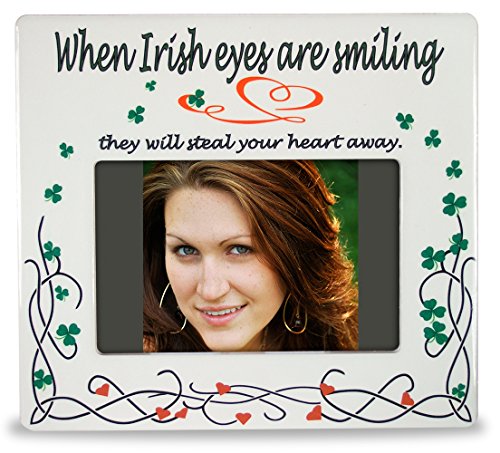 -. Feature : Beautiful ceramic Irish photo plaque with green shamrocks & red hearts. / Perfect gift for an Irish family for Christmas or Birthday. / Message on frame says:When Irish eyes are smiling, they will steal your heart away / Photo opening is 4" x 6" / SIZE: 8"W x 7.25"H