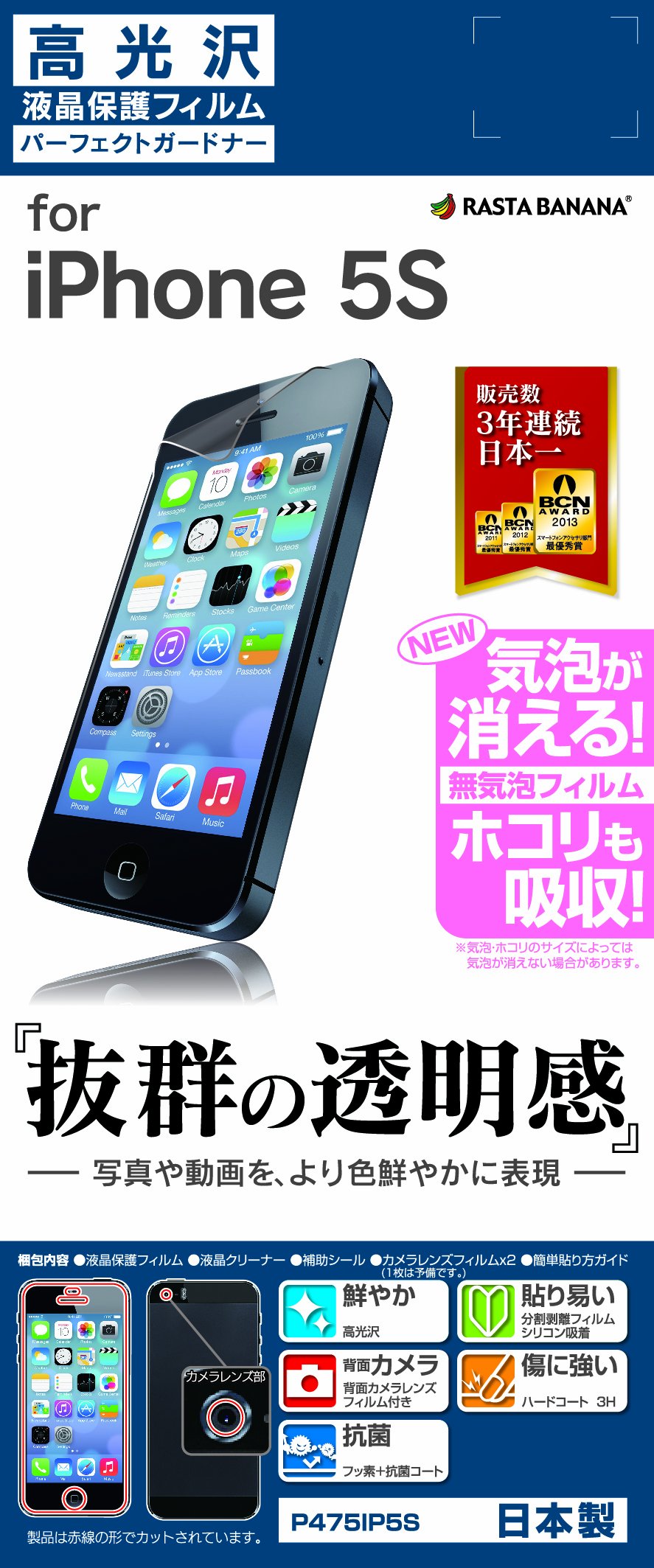 ● Manufacturer name: Raster banana ● Model number: P475IP5S ● Product name: iPhone 5s / 5 Screen Protector Sheet High gloss type ● JAN Code: 4988075555013 ● Bubbles disappear ● Special processing has been applied to the suction surface,