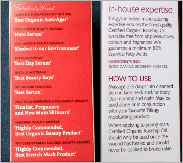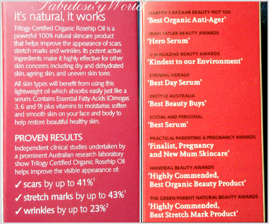 Trilogy’s new advanced formulation Rosehip Oil Antioxidant+ has been named “best natural face oil” in the 2012 Harper’s Bazaar Beauty Hot 100, just six months after launch, in a hat trick (3 years running) for the brand! The original Trilogy Certified Organic Rosehip Oil has fast become an iconic beauty product and a favourite of beauty editors and celebs everywhere. Named “Star Product” in Vogue Australia and “Editor’s Favourite” in Marie Claire Hong Kong, it has won more than 16 beauty awards around the world including Harper’s Bazaar Beauty Hot 100 in 2010 and 2011. Beauty director Newby Hands called it: “An organic miracle worker, this luxurious oil really makes a difference.” The Daily Mail reveals Famous Fans of rosehip oil include Dannii Minogue, Miranda Kerr, Gwyneth Paltrow, Victoria Beckham and Kate Middeton..." - And Hello! UK had this to say: