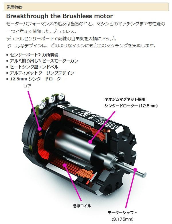 | モーターパフォーマンスの追及は当然のこと、マシンとのマッチングまでも性能の一つと考えて開発した、新世代ブラシレス。デュアルセンサーポートで配線の自由度を大幅にアップ。クールなデザインは、どのようなマシンにも完全なマッチングを実現します。 |