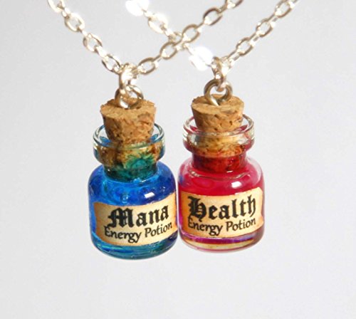 -. Title : Mana and Health BFF necklaces potion in a bottle geekery miniature food jewelry