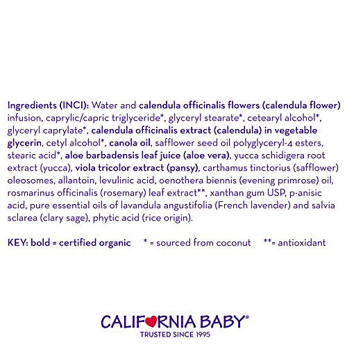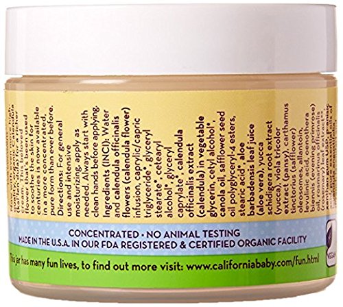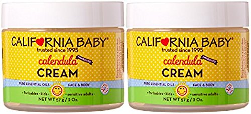2 oz / 60 grams jar with twist cap. Safe for newborns and older. Scented with our special Calming aromatherapy blend that includes French lavender. Nature's First-Aid! California Baby Calendula Cream is excellent for use on general diaper area, cradle cap, on cuts and scrapes, and may be used on face and body for extra-dry or sensitive skin. Botanically based, our light and fluffy Calendula Cream contains the active ingredient of Calendula, which has been used to heal the skin for centuries. California Baby Calendula Cream offers deep hydration, absorbs completely, and leaves skin feeling satiny smooth. Use daily for everyday protection and especially when the air is dry and baby's skin needs relief. The entire family can benefit from this soothing, multipurpose cream. We suggest that you try California Baby Calendula Cream and/or California Baby Botanical Moisturizing Cream in combination with any of our Shampoos & Bodywashes. Also add California Baby 'Soothing & Healing' Spray, and any of our non-chemical sunscreens to your skin care regime. No nut oils, gluten, soy, oat or dairy. Made in the U.S.A.Feature