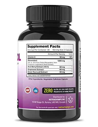 ★ HIGHEST POTENCY AVAILABLE - Want the most potent Resveratrol on the market? Then look no further, because we've delivered just that. Unlike competitors who hide behind proprietary blends, NutraChamps contains an unmatched 1400 mg. No brand comes even close to the 600mg of PURE Resveratrol packed into each pill, topped off with 100mg of extra antioxidants! With our additional blend of Grape Seed, Green Tea Leaf & Acai Berry, you'll be guaranteed the maximum benefits Resveratrol can offer.
