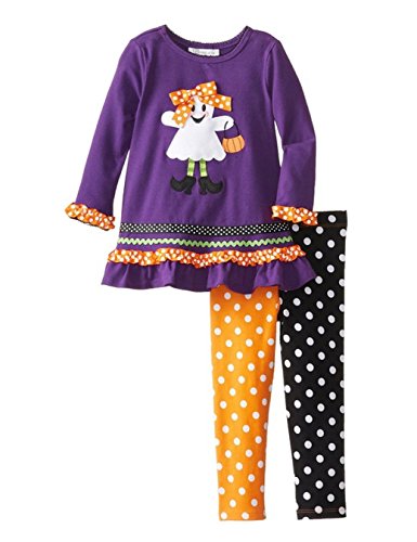 -. Feature : Adorable 2-piece set outfit by Bonnie Baby (line from Bonnie Jean). / The long sleeve dress features solid purple knit throughout, black contrast trim at round neckline and sleeve hem, white ghost with orange bow & pumpkin trick or treat applique' at the front center. Black white dot grosgrain ribbon & green zig-zag trim around above the hem, orange white dot grosgrain ribbon trim around the insert ruffled hem. Comes with a coordinating black / orange white dots leggings. / Dress and leggings are mixture of 95% cotton & %5 spandex. / A fun and stylish little dress outfit for your little one to wear during the Halloween season.