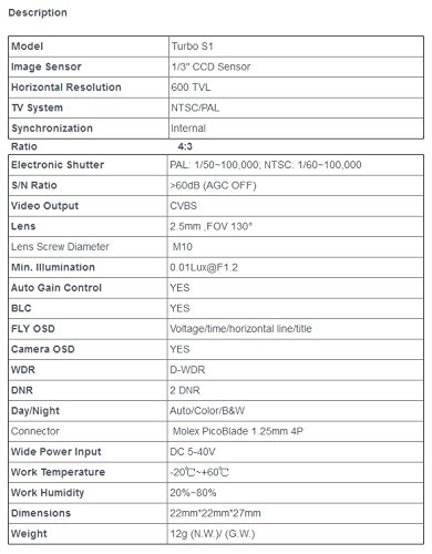 High-Definition: Caddx Turbo S1 mini FPV Camera have 150 degree wide field of vision and 600tvl horizontal resolutio, So that camera has more high-definition screen